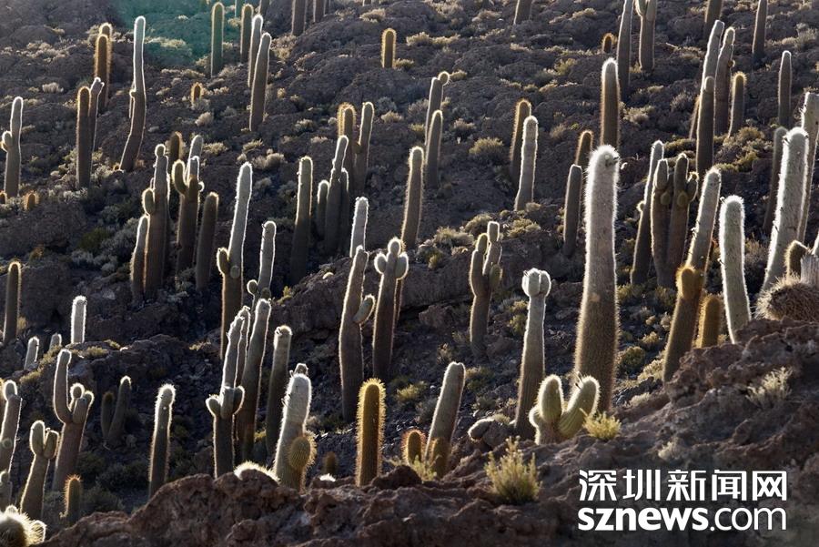 烏尤尼鹽沼在玻利維亞波托西省西部高原內(nèi),在鹽沼中央附近有一個(gè)名為魚(yú)島(從遠(yuǎn)處看,此島像一條魚(yú)的形狀故名)的小島,上面長(zhǎng)滿了仙人柱。李仁奇 攝