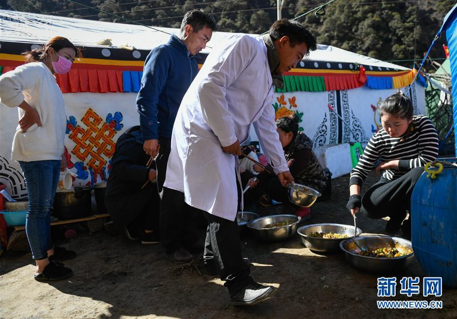 11月12日,在西藏昌都市江達(dá)縣波羅鄉(xiāng)康扎西安置點(diǎn),工作人員在臨時(shí)廚房打飯。 西藏自治區(qū)江達(dá)縣波羅鄉(xiāng)康扎西安置點(diǎn),離波羅鄉(xiāng)政府直線距離約3公里,位于一處地勢(shì)開闊平緩的山谷中,比堰塞湖水面高出100多米。10月11日金沙江白格段山體滑坡發(fā)生后,當(dāng)?shù)鼐驮谶@里設(shè)立了安置點(diǎn),安置附近受災(zāi)群眾。 新華社記者 劉東君 攝