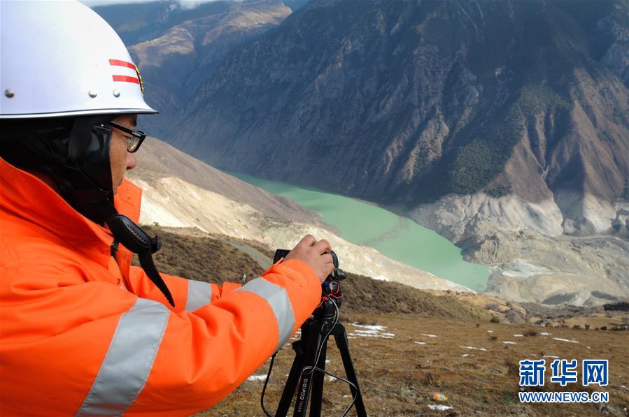 11月12日,西藏昌都市消防隊員從高點觀察泄流情況。新華社記者 堅贊 攝