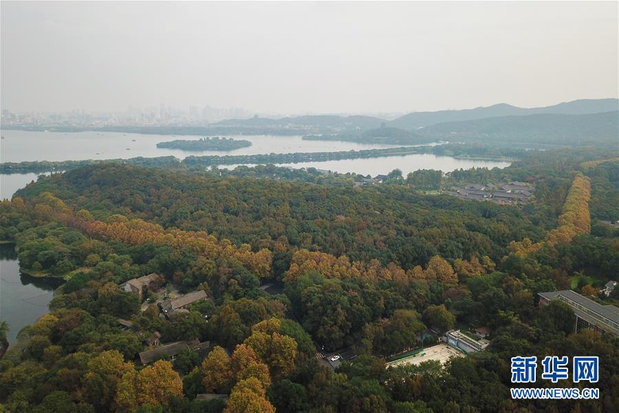11月13日無人機拍攝的杭州西湖一景。 時值初冬,杭州市西湖景區(qū)層林盡染,色彩斑斕,別有一番韻味。