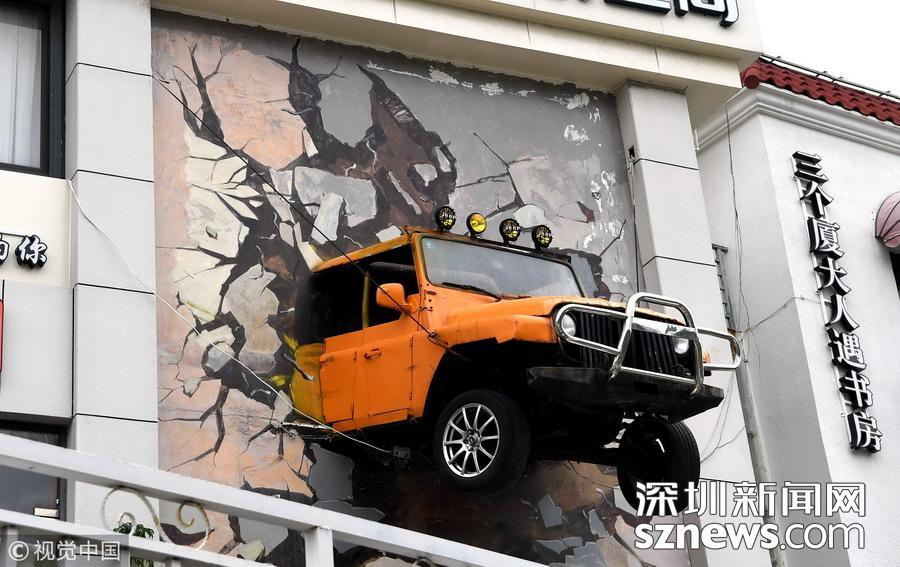 訊 2018年11月13日,在廈門市區(qū)環(huán)島路上,一輛裝飾在建筑墻面上的汽車,結(jié)合3D圖案讓人感覺汽車“破”墻而出,創(chuàng)意十足。