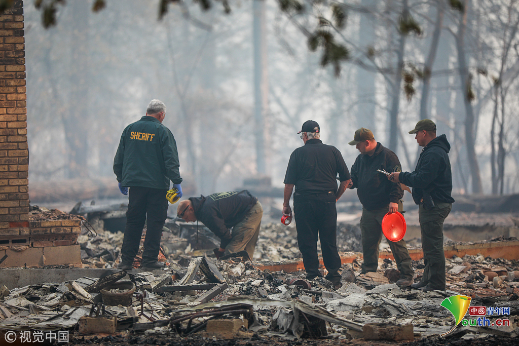 11月18日,在美國加利福尼亞州比尤特縣天堂鎮(zhèn),救援人員在山火廢墟中工作。