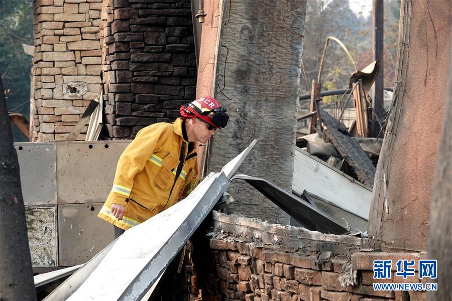11月18日,在美國加利福尼亞州比尤特縣天堂鎮(zhèn),一名消防人員查看廢墟。 新華社記者吳曉凌攝