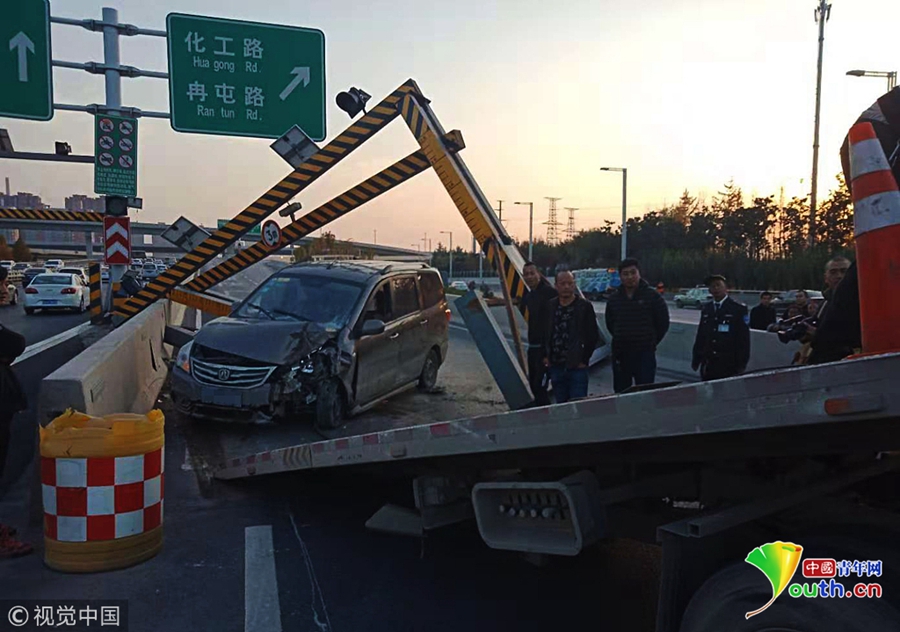 2018年11月19日下午,鄭州市西三環(huán)化工路立交橋,沿西三環(huán)由北向南方向上橋口處,一輛商務面包車失控撞塌了3米限高架,橋上交通瞬間中斷。 圖片來源:視覺中國