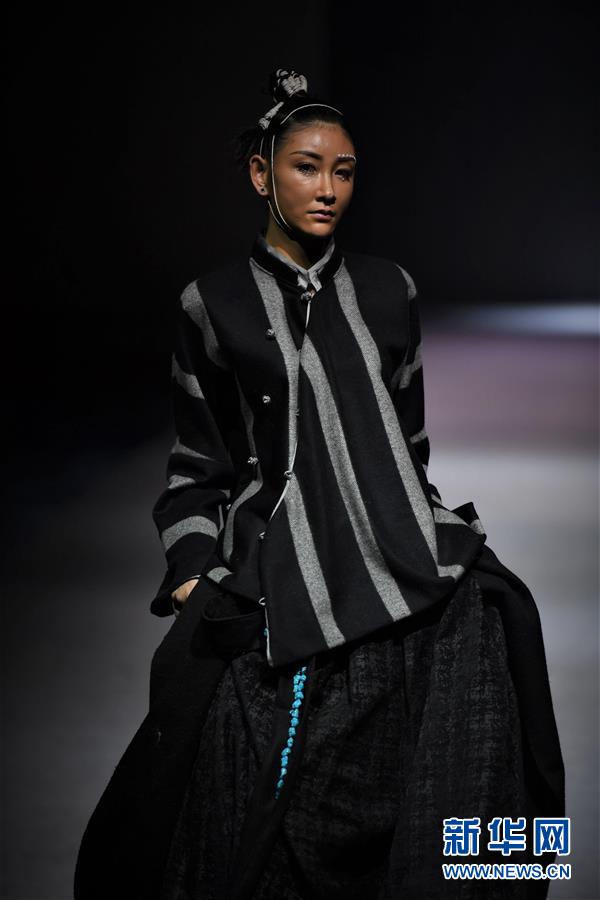 模特在AJ-NAMO藏裝秀上展示藏族設(shè)計(jì)師阿佳娜姆設(shè)計(jì)的時(shí)裝(11月18日攝)。 新華社記者 普布扎西攝