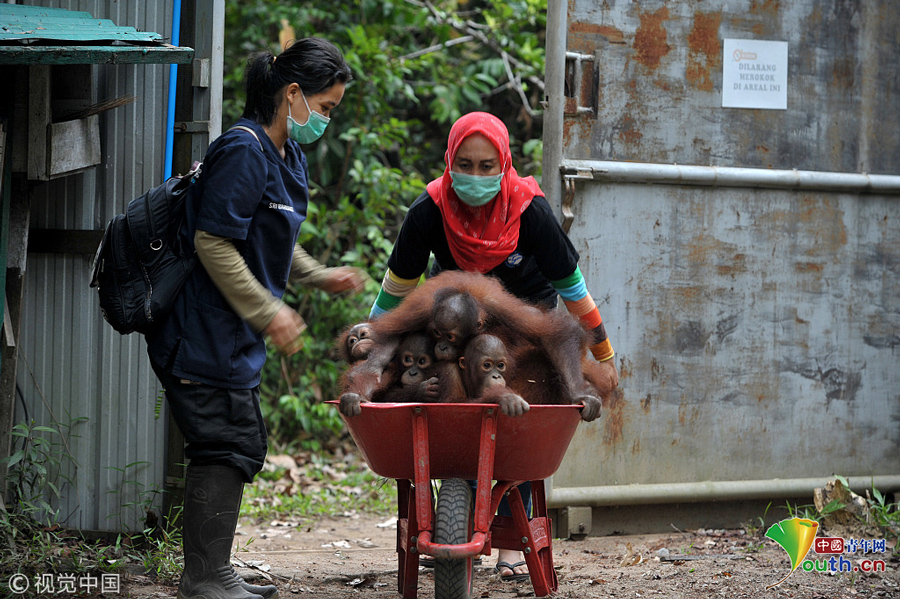 當?shù)貢r間2018年9月18日,印尼加里曼丹克塔邦,國際動物救援(IAR)猩猩安全與保護中心里,飼養(yǎng)員用獨輪車把猩猩寶寶送到森林學(xué)校。圖片作者:Newscom