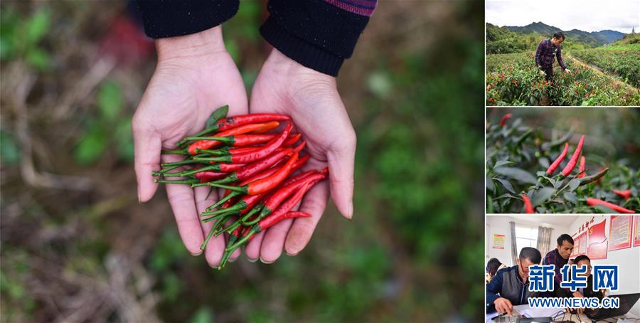 拼版照片:左圖為在大浪鎮(zhèn)大德村,龍德手捧剛剛收獲的辣椒;右上圖為龍德在摘辣椒;右中圖為合作社種植的辣椒;右下圖為龍德(中)在辦公室里工作(照片均攝于11月18日)。龍德是大德村的致富帶頭人,目前合作社種植有400多畝辣椒,帶動(dòng)106戶貧困戶參與。 廣西融水苗族自治縣是國家扶貧工作重點(diǎn)縣,全縣“九山半水半分田”,生活生產(chǎn)環(huán)境較為惡劣,脫貧攻堅(jiān)任務(wù)艱巨,目前還有7.68萬貧困人口。面對(duì)經(jīng)濟(jì)發(fā)展落后、貧困面廣且程度深的現(xiàn)狀,當(dāng)?shù)匕衙撠毠?jiān)與創(chuàng)新產(chǎn)業(yè)扶持相結(jié)合,依托生態(tài)資源優(yōu)勢(shì),實(shí)施“特色產(chǎn)業(yè)富民行動(dòng)”,通過發(fā)展特色民族旅游、林下經(jīng)濟(jì)和特色養(yǎng)殖業(yè)等扶貧產(chǎn)業(yè),帶動(dòng)貧困群眾依靠勤勞的雙手,拔窮根摘窮帽,實(shí)現(xiàn)脫貧致富。據(jù)了解,目前全縣貧困戶參與特色產(chǎn)業(yè)發(fā)展的有2.9萬戶,扶貧產(chǎn)業(yè)覆蓋率達(dá)95%。 新華社記者 黃孝邦 攝