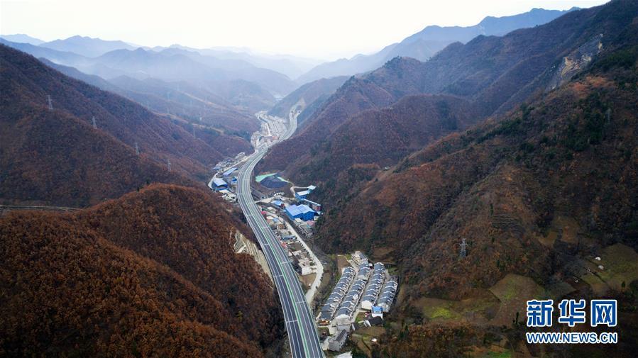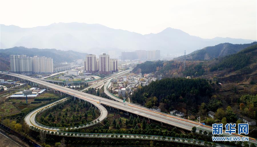 11月20日拍攝的水陽(yáng)高速公路與包茂高速公路相接的樞紐互通式立交(無(wú)人機(jī)拍攝)。 近日,記者從陜西省交通建設(shè)集團(tuán)公司了解到,陜西柞水至山陽(yáng)高速公路已全線貫通即將通車。據(jù)介紹,(柞)水(山)陽(yáng)高速公路全長(zhǎng)78.8公里,開(kāi)通后將實(shí)現(xiàn)包茂高速、福銀高速在陜南商洛地區(qū)的連接,開(kāi)辟出秦嶺南麓的一條橫向高速大通道,對(duì)完善陜西高速公路路網(wǎng)結(jié)構(gòu)、促進(jìn)陜南區(qū)域經(jīng)濟(jì)發(fā)展、加快山區(qū)群眾脫貧致富具有重要意義。 新華社記者劉瀟攝