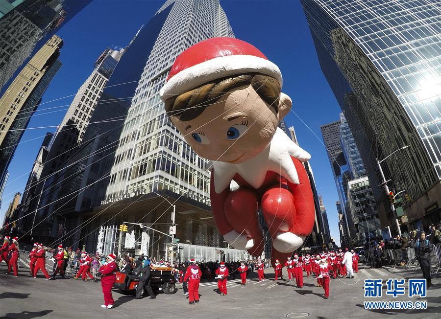 當(dāng)日,第92屆梅西感恩節(jié)大游行在紐約舉行,各式各樣的玩偶?xì)馇?、花車?duì)伍在曼哈頓的摩天大樓間穿行,吸引數(shù)百萬民眾前來觀看。梅西感恩節(jié)大游行始于1924年,是全美規(guī)模最大的感恩節(jié)游行。