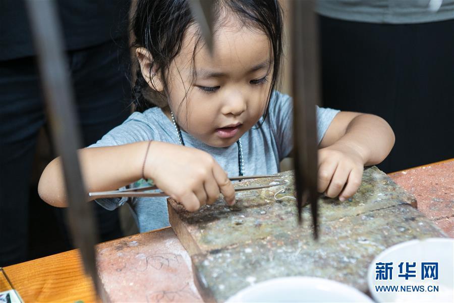 8月3日,來(lái)自西安的小朋友月白在龍?zhí)?yáng)銀飾體驗(yàn)工作室中學(xué)習(xí)制作銀飾。