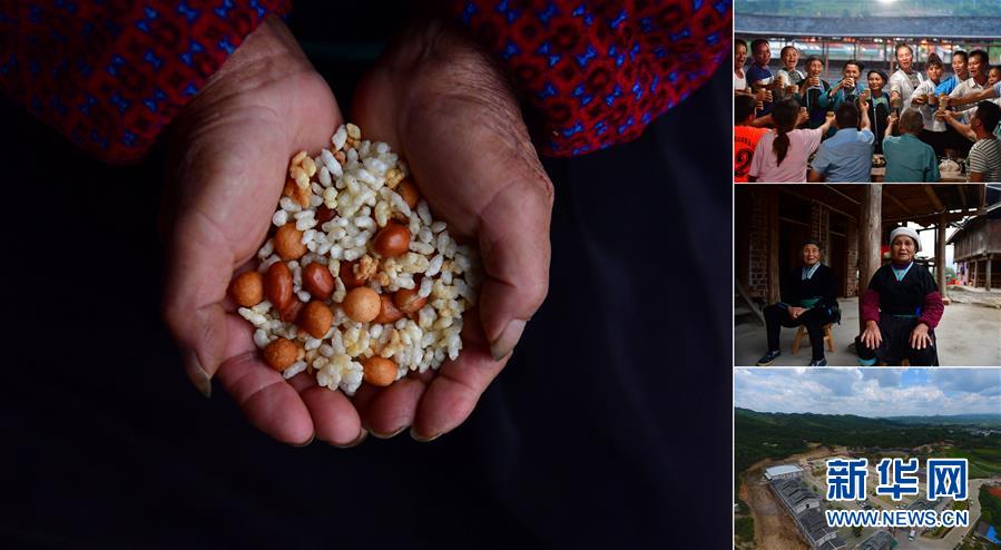 拼版照片:左圖為在廣西融水雙龍溝森林旅游度假區(qū)夢(mèng)嗚苗寨,70歲的韋院媽手捧油茶原料:花生、油果、蔭米(11月20日攝);右上圖為韋院媽(左六)在景區(qū)里和游客們一起歡度苗族新禾節(jié)(7月18日攝);右中圖為韋院媽(右)在家里休息(11月20日攝);右下圖為夢(mèng)嗚苗寨(7月19日無(wú)人機(jī)拍攝)。韋院媽是桿洞鄉(xiāng)錦洞村的貧困戶,今年3月,她和村里的13戶貧困戶一起舉家搬到雙龍溝森林旅游度假區(qū)打造的夢(mèng)嗚苗寨,景區(qū)將貧困戶引入苗寨生活工作,保證貧困家庭有穩(wěn)定的收入。 廣西融水苗族自治縣是國(guó)家扶貧工作重點(diǎn)縣,全縣“九山半水半分田”,生活生產(chǎn)環(huán)境較為惡劣,脫貧攻堅(jiān)任務(wù)艱巨,目前還有7.68萬(wàn)貧困人口。面對(duì)經(jīng)濟(jì)發(fā)展落后、貧困面廣且程度深的現(xiàn)狀,當(dāng)?shù)匕衙撠毠?jiān)與創(chuàng)新產(chǎn)業(yè)扶持相結(jié)合,依托生態(tài)資源優(yōu)勢(shì),實(shí)施“特色產(chǎn)業(yè)富民行動(dòng)”,通過(guò)發(fā)展特色民族旅游、林下經(jīng)濟(jì)和特色養(yǎng)殖業(yè)等扶貧產(chǎn)業(yè),帶動(dòng)貧困群眾依靠勤勞的雙手,拔窮根摘窮帽,實(shí)現(xiàn)脫貧致富。據(jù)了解,目前全縣貧困戶參與特色產(chǎn)業(yè)發(fā)展的有2.9萬(wàn)戶,扶貧產(chǎn)業(yè)覆蓋率達(dá)95%。 新華社記者 黃孝邦 攝