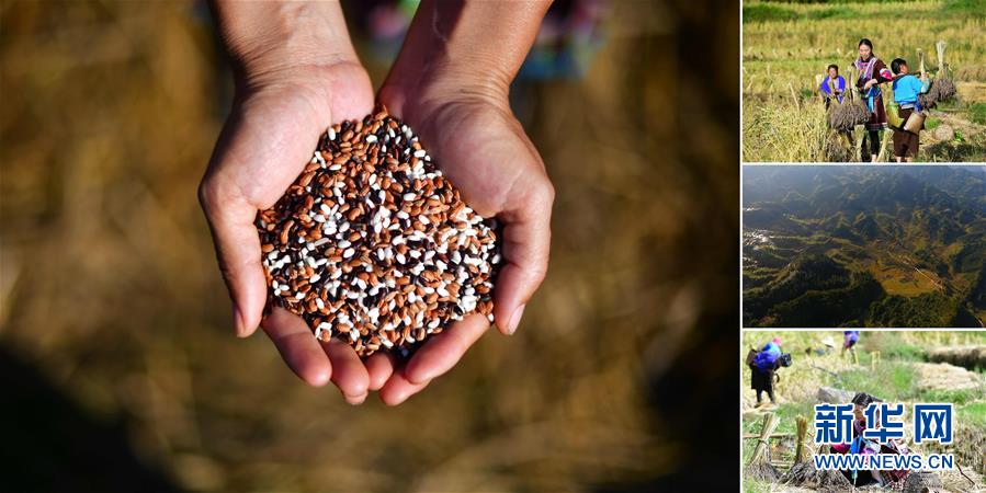 拼版照片:左圖為在安太鄉(xiāng)元寶村,80歲的賈榮專手捧剛剛收獲的香糯;右上圖為成熟待收的香糯;右中圖為賈榮專(左)在收割香糯;右下圖為村民們?cè)谑障闩矗ㄕ掌鶖z于10月30日)。2017年,賈榮專加入村里的香糯種植合作社。香糯是廣西融水大苗山的特產(chǎn),它生長(zhǎng)在高寒高海拔的特殊自然環(huán)境中,產(chǎn)量少,營(yíng)養(yǎng)價(jià)值高。 廣西融水苗族自治縣是國(guó)家扶貧工作重點(diǎn)縣,全縣“九山半水半分田”,生活生產(chǎn)環(huán)境較為惡劣,脫貧攻堅(jiān)任務(wù)艱巨,目前還有7.68萬(wàn)貧困人口。面對(duì)經(jīng)濟(jì)發(fā)展落后、貧困面廣且程度深的現(xiàn)狀,當(dāng)?shù)匕衙撠毠?jiān)與創(chuàng)新產(chǎn)業(yè)扶持相結(jié)合,依托生態(tài)資源優(yōu)勢(shì),實(shí)施“特色產(chǎn)業(yè)富民行動(dòng)”,通過(guò)發(fā)展特色民族旅游、林下經(jīng)濟(jì)和特色養(yǎng)殖業(yè)等扶貧產(chǎn)業(yè),帶動(dòng)貧困群眾依靠勤勞的雙手,拔窮根摘窮帽,實(shí)現(xiàn)脫貧致富。據(jù)了解,目前全縣貧困戶參與特色產(chǎn)業(yè)發(fā)展的有2.9萬(wàn)戶,扶貧產(chǎn)業(yè)覆蓋率達(dá)95%。 新華社記者 黃孝邦 攝
