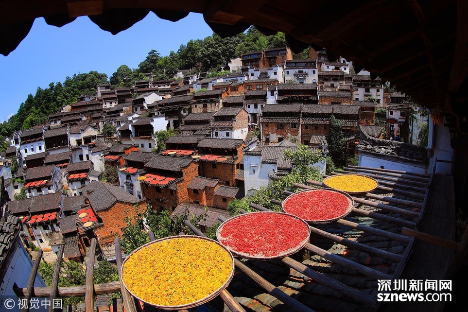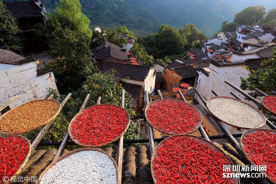 2018年8月7日,江西婺源縣篁嶺古村,壯觀的“曬秋”場(chǎng)景。 深圳新聞網(wǎng)訊 2018年8月7日,江西婺源縣篁嶺古村落,壯觀“曬秋”場(chǎng)景。當(dāng)日立秋節(jié)氣,江西婺源縣篁嶺古村的農(nóng)作物普遍豐收,村民們又迎來(lái)了一年一度的“曬秋”季。村民們將收獲來(lái)的紅辣椒、玉米、南瓜、稻谷和菊花等色彩斑斕的農(nóng)作物,晾曬在依山而建的徽派民居房前屋后的木制曬架上,在秋日陽(yáng)光的照射下,色彩繽紛圓圓的曬扁,鋪就在錯(cuò)落有致的徽派民居之間,格外璀璨奪目,蔚為壯觀。目前,“篁嶺曬秋”已經(jīng)成為中國(guó)鄉(xiāng)村旅游的一張名片。