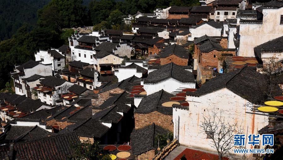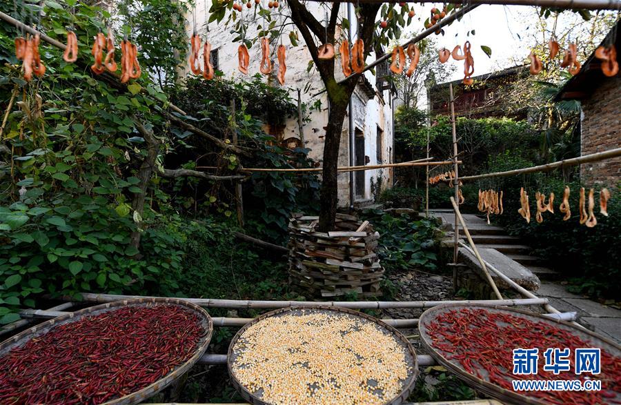 2017年10月26日拍攝的篁嶺古村。家家戶(hù)戶(hù)晾曬各種蔬果及皇菊。近日天氣晴朗,江西省婺源縣江灣鎮(zhèn)篁嶺村村民抓住時(shí)機(jī)采摘、晾曬皇菊及蔬果。明黃的菊花、火紅的辣椒……各種顏色將篁嶺古村裝扮成巨大的“調(diào)色板”,引來(lái)眾多游客感受鄉(xiāng)村美景。新華社記者宋振平 攝