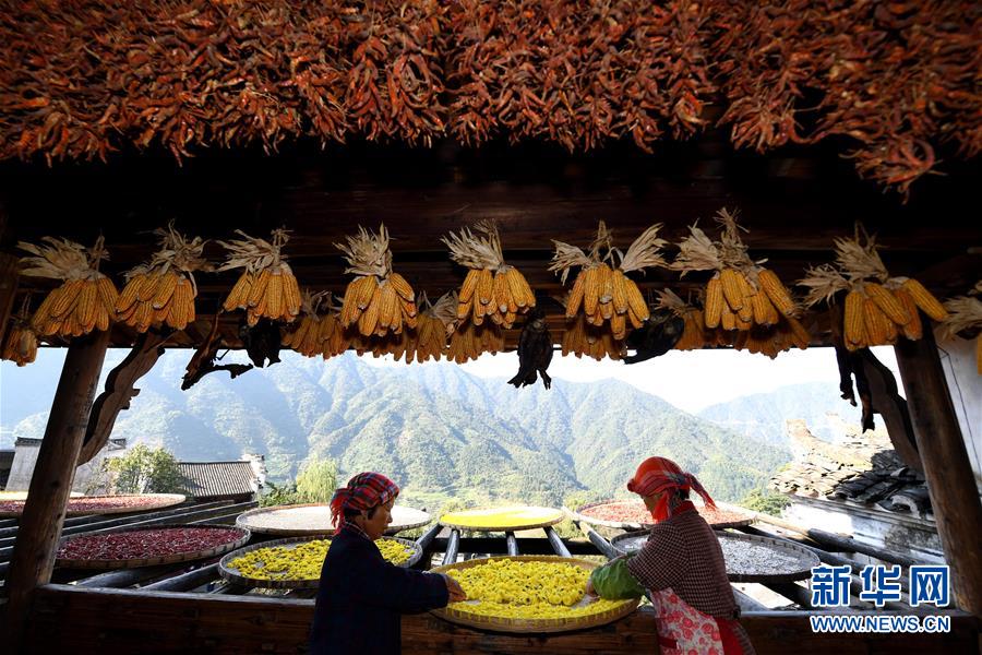 2017年10月26日,篁嶺村村民在晾曬皇菊。近日天氣晴朗,江西省婺源縣江灣鎮(zhèn)篁嶺村村民抓住時(shí)機(jī)采摘、晾曬皇菊及蔬果。明黃的菊花、火紅的辣椒……各種顏色將篁嶺古村裝扮成巨大的“調(diào)色板”,引來(lái)眾多游客感受鄉(xiāng)村美景。新華社記者宋振平 攝