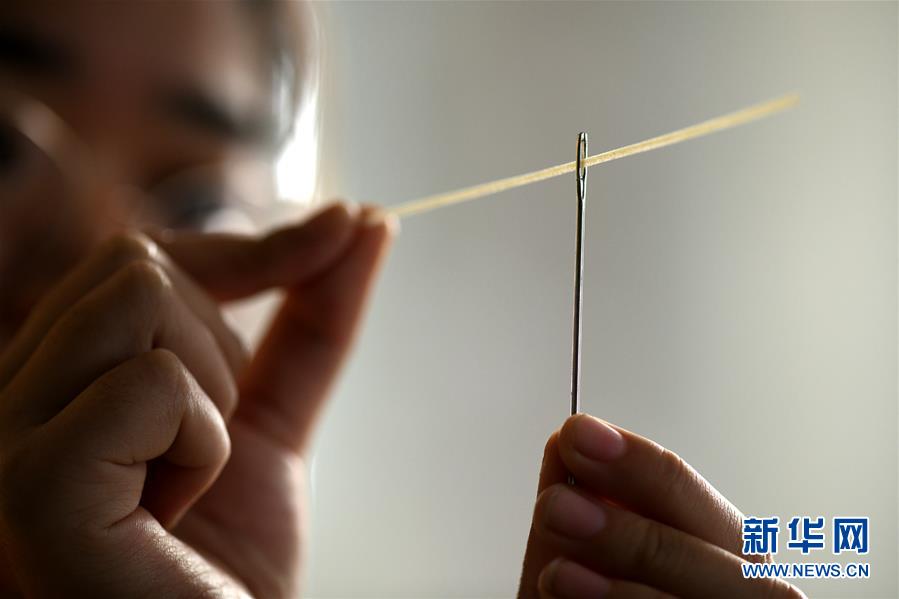 11月23日,在石家莊市藁城區(qū)耿家莊村某宮面生產(chǎn)廠(chǎng),工人演示用藁城宮面穿過(guò)縫針眼。