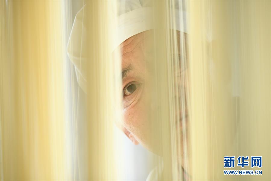 11月23日,在石家莊市藁城區(qū)耿家莊村某宮面生產(chǎn)廠(chǎng),藁城宮面制作技藝代表性傳承人董根川進(jìn)行分面。