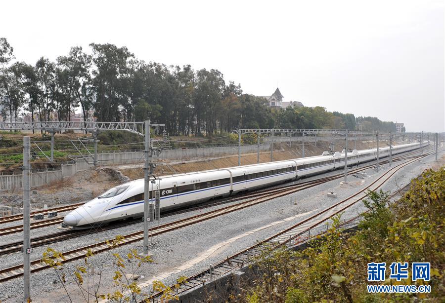 廣西桂林至北京高鐵列車在桂林市靈川縣境內(nèi)行駛(2013年12月28日攝)。 廣西壯族自治區(qū)成立60年來,鐵路建設(shè)發(fā)生翻天覆地的變化。來自中國鐵路南寧局集團(tuán)有限公司的數(shù)據(jù)顯示,1958年廣西鐵路總里程為1346.3公里,如今廣西鐵路總里程達(dá)5191公里。廣西與周邊相鄰省份間實(shí)現(xiàn)動(dòng)車“公交化”開行。此外,北部灣港—重慶班列、東盟海產(chǎn)品冷鏈班列、“百色一號(hào)”果蔬專列等的開通和運(yùn)營(yíng),強(qiáng)化了鐵路供給的針對(duì)性和有效性。鐵路成為助推廣西經(jīng)濟(jì)社會(huì)快速發(fā)展的“大動(dòng)脈”。 新華社記者陸波岸攝