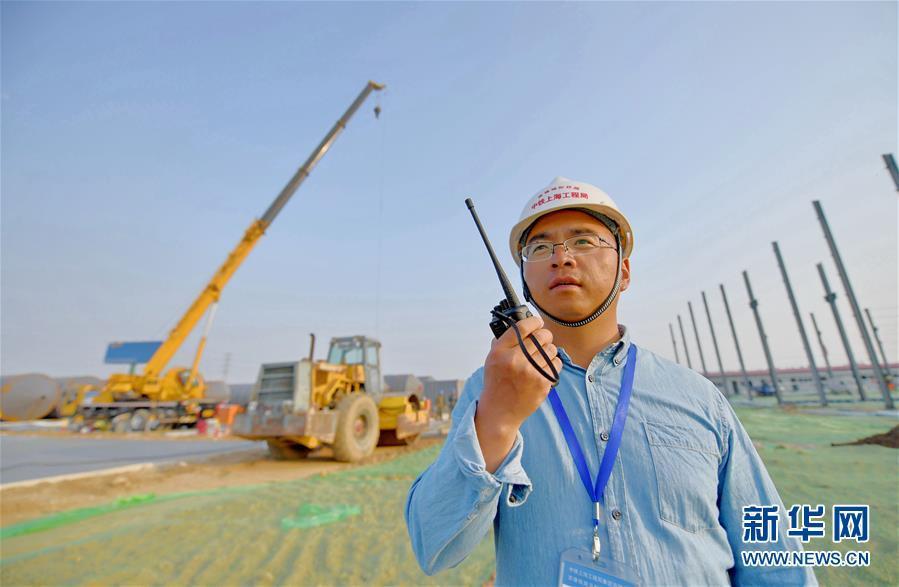 4月26日,來(lái)自中鐵上海工程局京雄城際鐵路五標(biāo)二分部的工程師韓正順在京雄城際鐵路工程五標(biāo)段小型構(gòu)件預(yù)制廠場(chǎng)地建設(shè)現(xiàn)場(chǎng)用對(duì)講機(jī)指揮作業(yè)。新華社記者王曉 攝 圖片來(lái)源:新華網(wǎng)