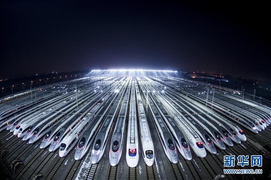 2018年2月1日凌晨,動(dòng)車組??吭谖錆h動(dòng)車段的存車線上,準(zhǔn)備進(jìn)行檢修和保溫作業(yè)。近百組在武漢動(dòng)車段經(jīng)過檢修、保溫作業(yè)的動(dòng)車組蓄勢(shì)待發(fā),迎接春運(yùn)。新華社記者 肖藝九 攝
