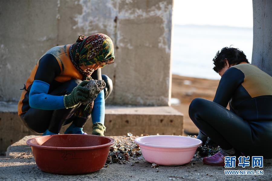 11月23日,海女們?cè)陧n國(guó)濟(jì)州島的一處海岸附近處理打撈出的海產(chǎn)品。新華社記者王婧嬙攝