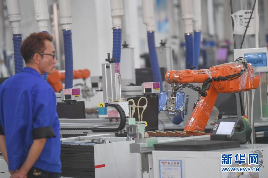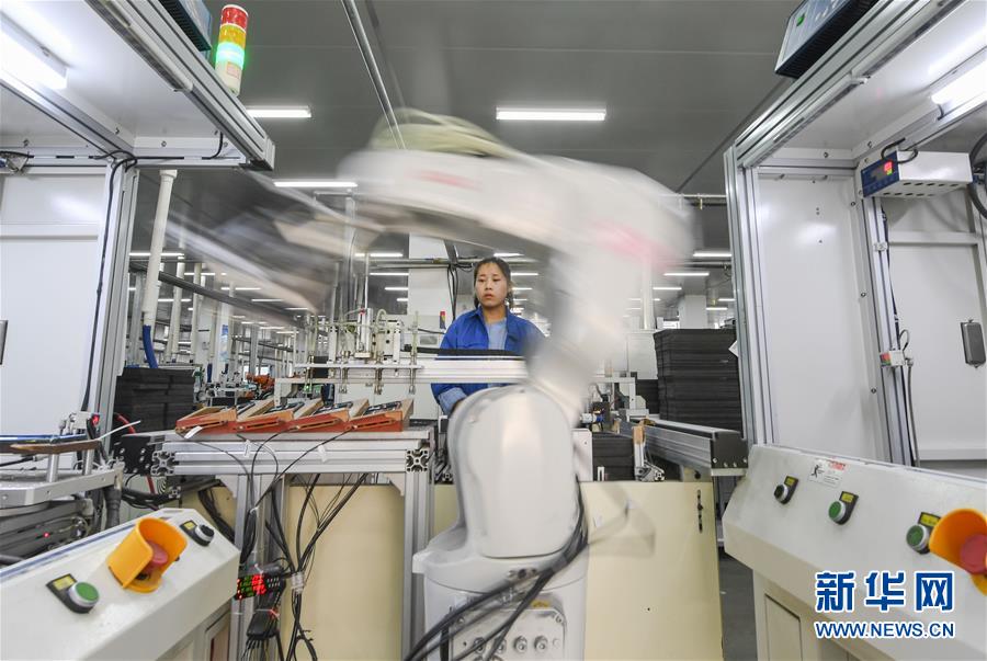 11月29日,在位于福建省石獅市蚶江鎮(zhèn)的通達(dá)集團(tuán)生產(chǎn)車間,工人在智能機(jī)械臂旁實(shí)時(shí)監(jiān)控一批小米手機(jī)殼的生產(chǎn)情況。 新華社記者 宋為偉 攝