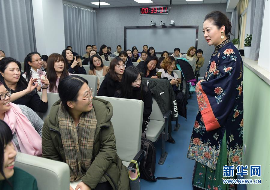 11月30日,在北京服裝學(xué)院,畢紅身著傳統(tǒng)服裝在課堂上向師生介紹清代女性服飾。 新華社記者李賀攝
