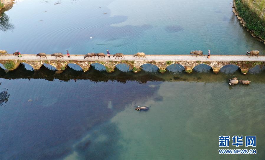 廣西百色靖西市新靖鎮(zhèn)鵝泉村村民從古老的石橋上趕?;卮澹?1月27日無人機拍攝)。