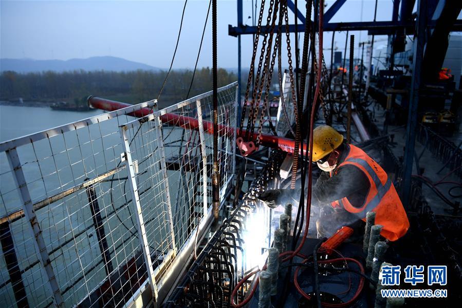 11月17日,施工人員在商合杭鐵路跨淮河特大橋合龍現(xiàn)場(chǎng)作業(yè)。