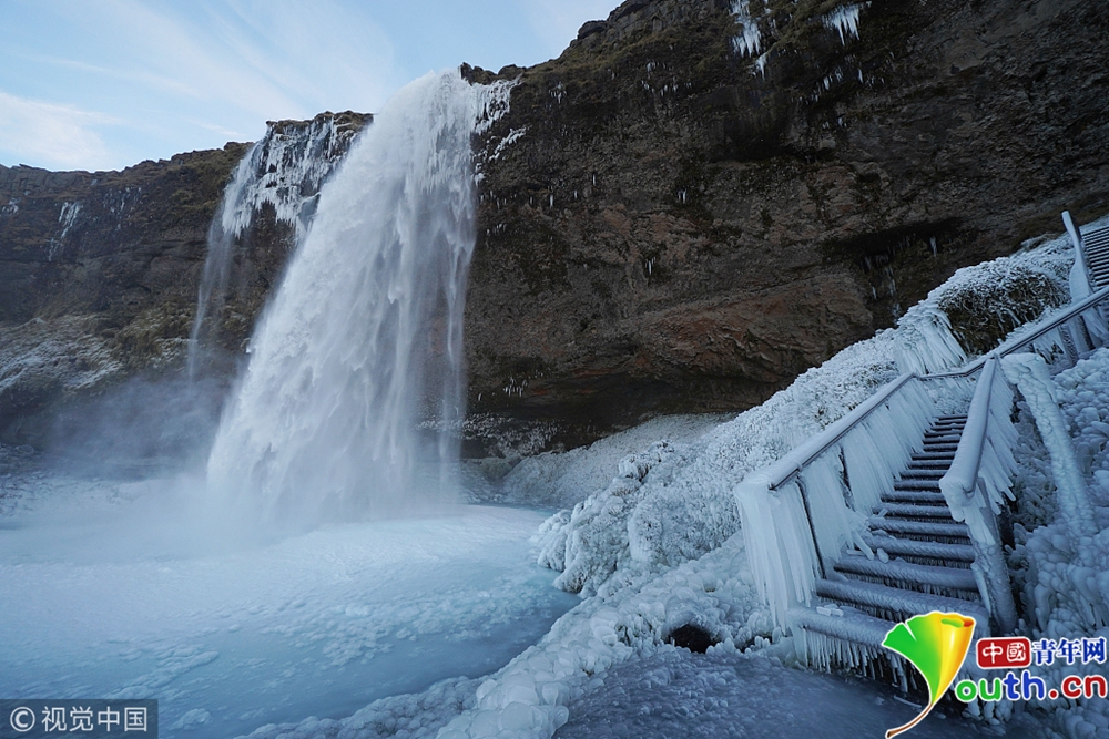 近日,冰島的塞里雅蘭瀑布在零下12攝氏度的氣溫下結(jié)冰,畫面彷如天外仙境。圖片來源:視覺中國(guó)