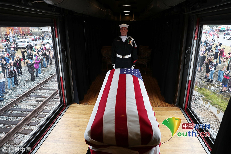 當(dāng)?shù)貢r(shí)間2018年12月6日,美國(guó)德州,美國(guó)前總統(tǒng)老布什將落葬德州農(nóng)機(jī)大學(xué)布什總統(tǒng)圖書館和博物館后面的布什家族墓地,與他半年前去世的妻子芭芭拉以及早夭的女兒蘿賓葬在一起。當(dāng)天,一輛葬禮專列將載著老布什的棺槨及其親朋,從休斯敦郊區(qū)開往老布什的最后安葬之地、德州農(nóng)機(jī)大學(xué)。這列火車的第六節(jié)車廂側(cè)面是透明的,人們可以在鐵軌旁看到老布什蓋著國(guó)旗的靈樞。圖片作者:Joe Raedle/視覺中國(guó)