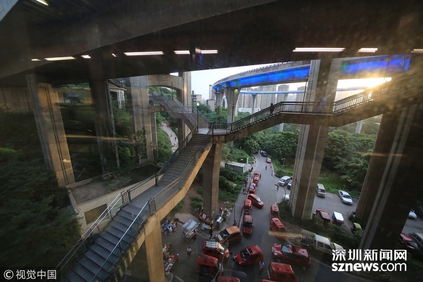 2018年5月29日,重慶,魔幻重慶又雙叒叕放大招!還有一個(gè)獨(dú)特的亮點(diǎn),重慶軌道交通3號(hào)線銅元局站,出口由一段長(zhǎng)梯銜接上方立交橋和下方的路面,與全國最高城市立交橋蘇家壩立交組成了獨(dú)特風(fēng)景,許多游客專門趕來拍照。