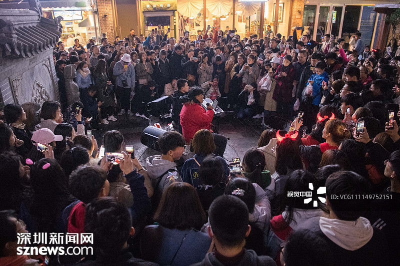 2018年4月6日晚,清明小長(zhǎng)假的第二天,在山東省濟(jì)南市復(fù)古老街區(qū)寬厚里,暫停演出有段時(shí)日的網(wǎng)紅歌唱組合“連音社”悄然復(fù)出,吸引了當(dāng)?shù)匾约皝碜匀珖鞯赜慰偷膰^。