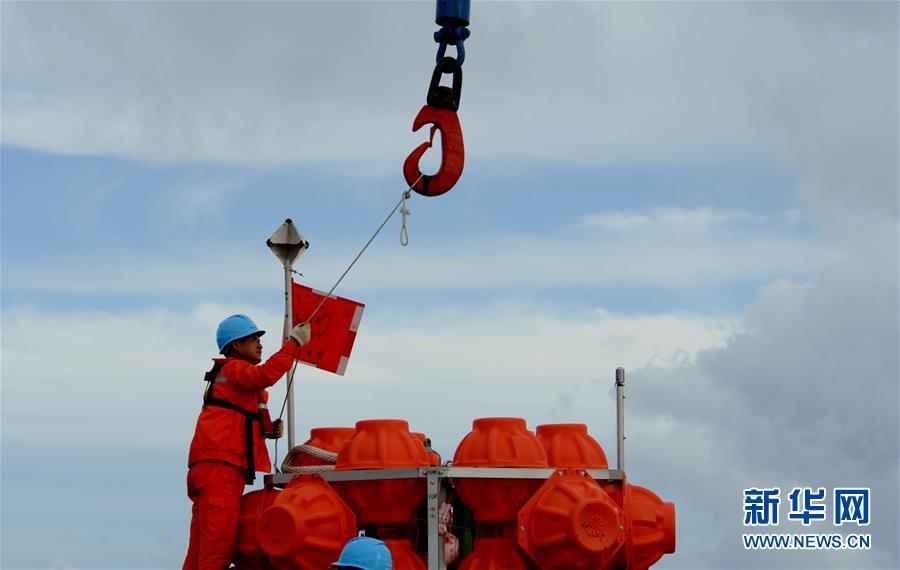 考察隊(duì)員對(duì)“彩虹魚”著陸器進(jìn)行掛鉤作業(yè)(12月10日攝)。 由上海海洋大學(xué)和西湖大學(xué)聯(lián)合組成的“彩虹魚”科考團(tuán)隊(duì),12月11日在全球最深的海溝——馬里亞納海溝成功完成兩臺(tái)“彩虹魚”第二代著陸器的萬米級(jí)海試,深度分別為10918米和10899米。 新華社記者 張建松 攝