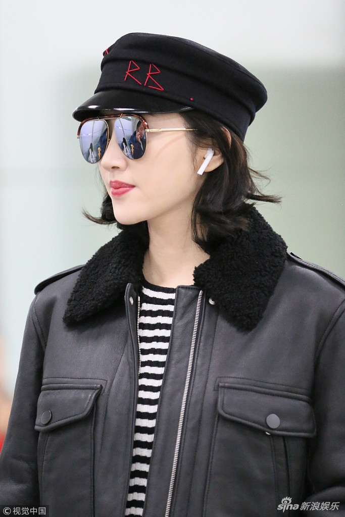 日前,景甜現(xiàn)身機(jī)場(chǎng),身穿黑色皮夾克超有范兒,戴小帽酷似甜美女軍官。視覺(jué)中國(guó)/圖