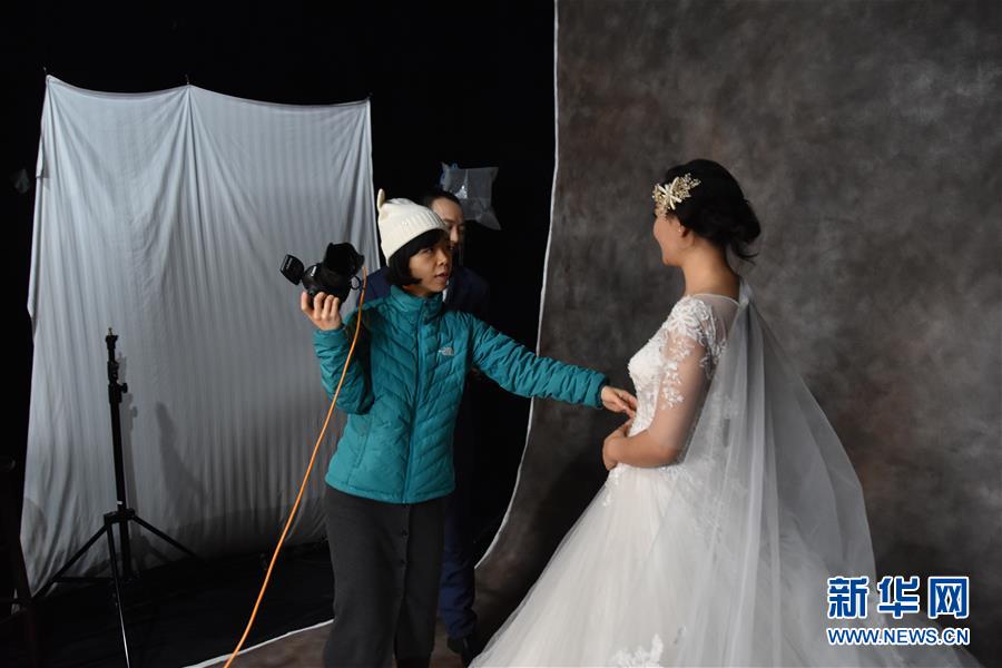 攝影師羅嫻在工地上搭建的臨時攝影棚內(nèi)指導農(nóng)民工夫妻擺姿勢(12月10日攝)。 新華社記者 白田田 攝