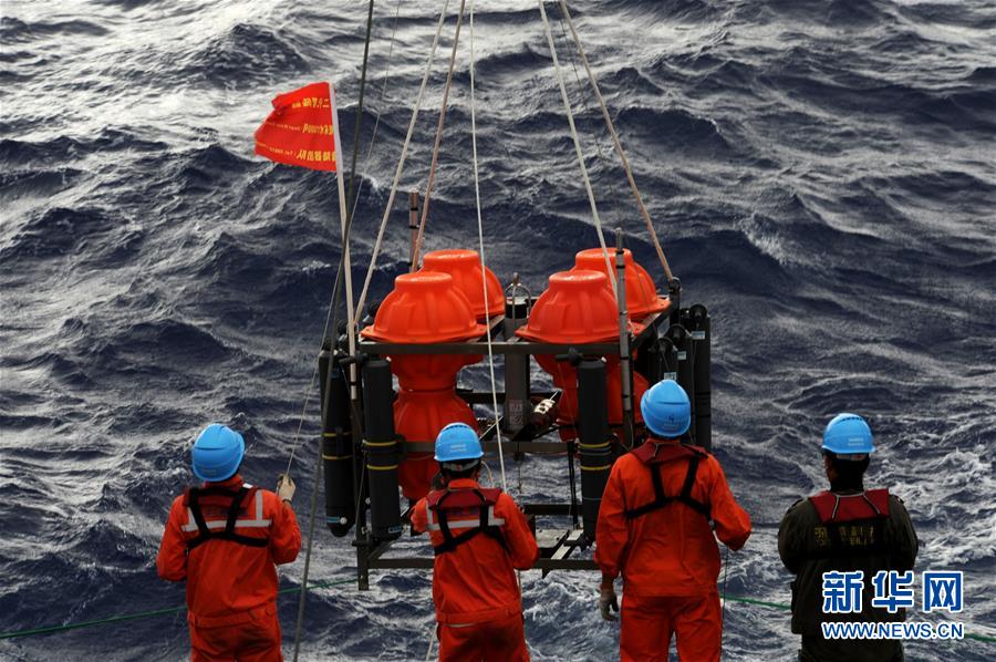 考察隊(duì)員在“沈括”號(hào)上布放“彩虹魚”著陸器(12月15日攝)。