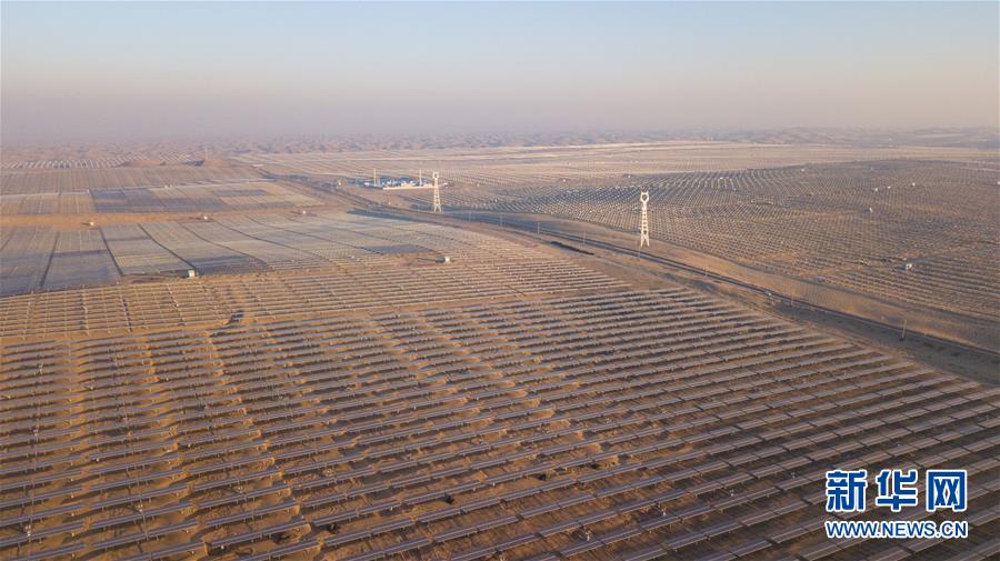 位于庫布其沙漠腹地的達拉特光伏發(fā)電應(yīng)用領(lǐng)跑基地一期500兆瓦項目(12月13日攝)。