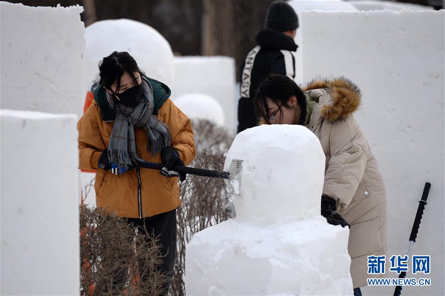 12月17日,雪雕師在松花江畔制作雪雕景觀。 新華社記者王凱攝