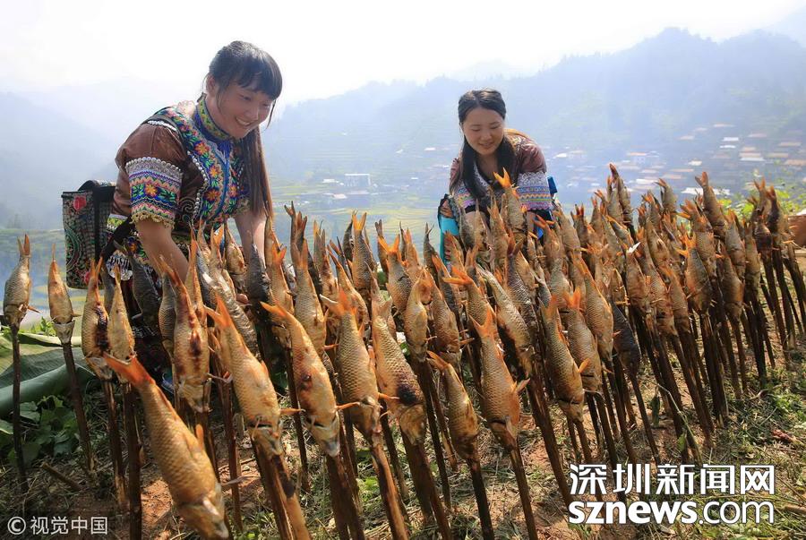 廣西柳州市融水縣山區(qū)有插秧時節(jié)放養(yǎng)鯉魚苗的習(xí)俗,金秋時節(jié)稻熟魚肥,收稻燒魚成為別致一景。