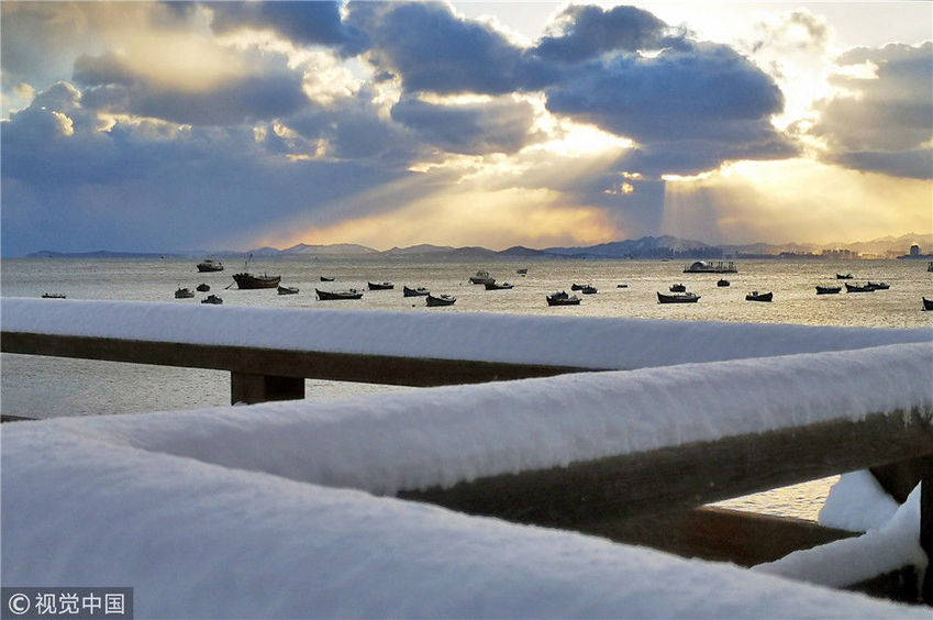 山東煙臺迎來初雪 獨特的海濱雪景美若童話