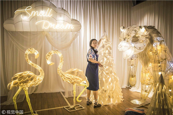 2018年5月6日,廣州,在天河區(qū)一家大商場辦個(gè)展時(shí),用紙片做成的北極熊、大松樹、火烈鳥、紙房子在光線的配合下美輪美奐,吸引了很多顧客駐足?!皫缀趺總€(gè)人一看到,都會(huì)走進(jìn)那個(gè)夢(mèng)幻的場景里,和這些紙雕一起合影。”圖片攝于2018年5月6日。南塘/視覺中國