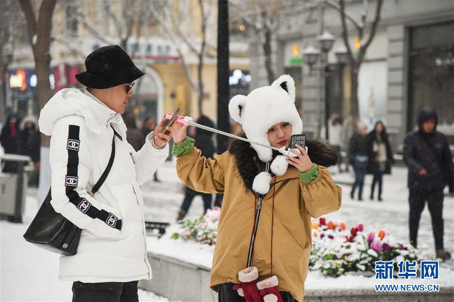 12月21日,游客在哈爾濱中央大街自拍。當(dāng)日,“冰城”哈爾濱迎來降雪天氣,整個(gè)城市變得銀裝素裹。新華社記者韓宇攝