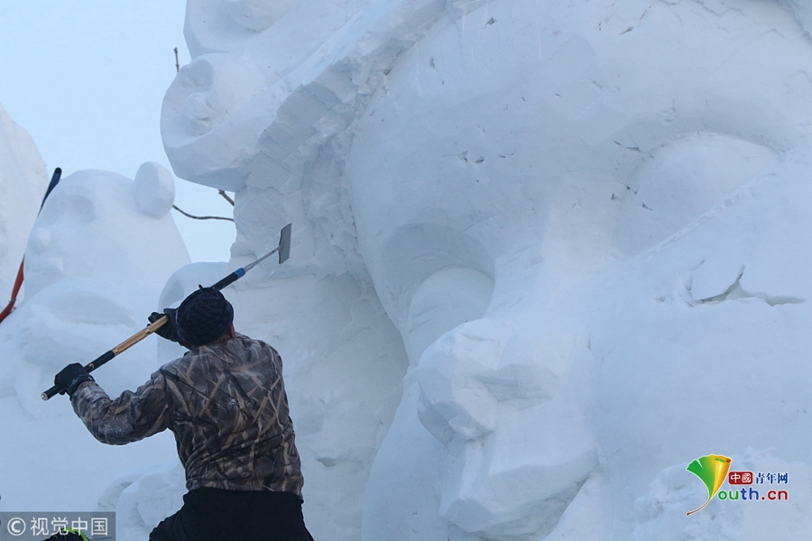 國內(nèi)最大的雪雕盛會(huì)太陽島雪博會(huì)正在緊鑼密鼓建設(shè)中,部分雪雕雛形已現(xiàn),雪雕師正在精雕細(xì)刻打磨中。