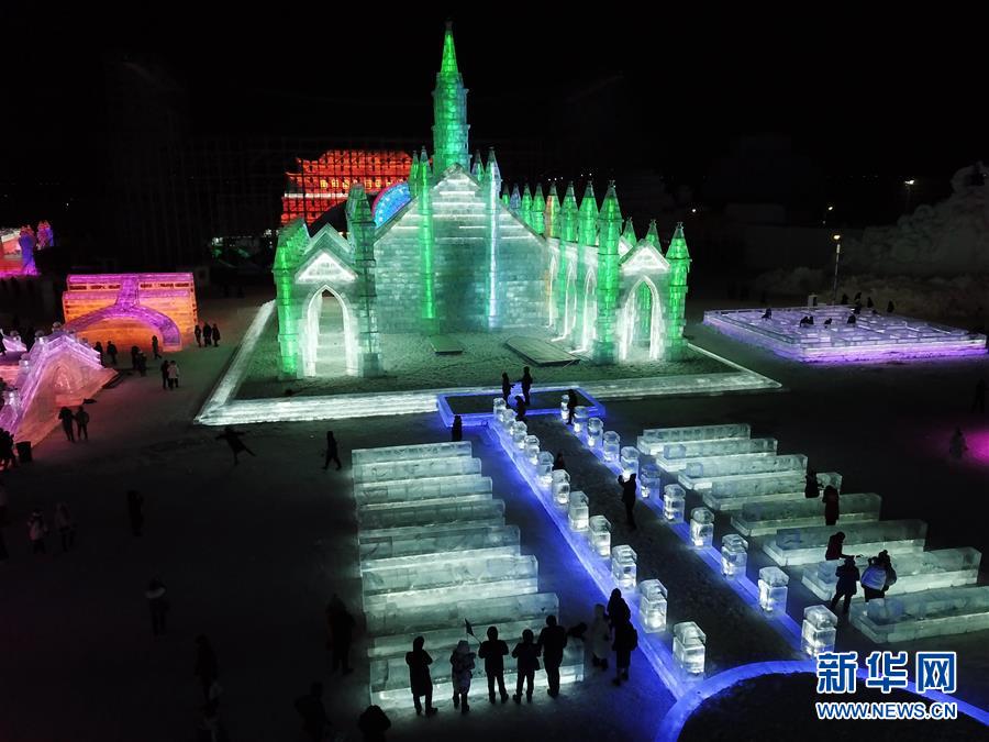 這是哈爾濱冰雪大世界園區(qū)內(nèi)的一處景觀(12月23日無(wú)人機(jī)拍攝)。