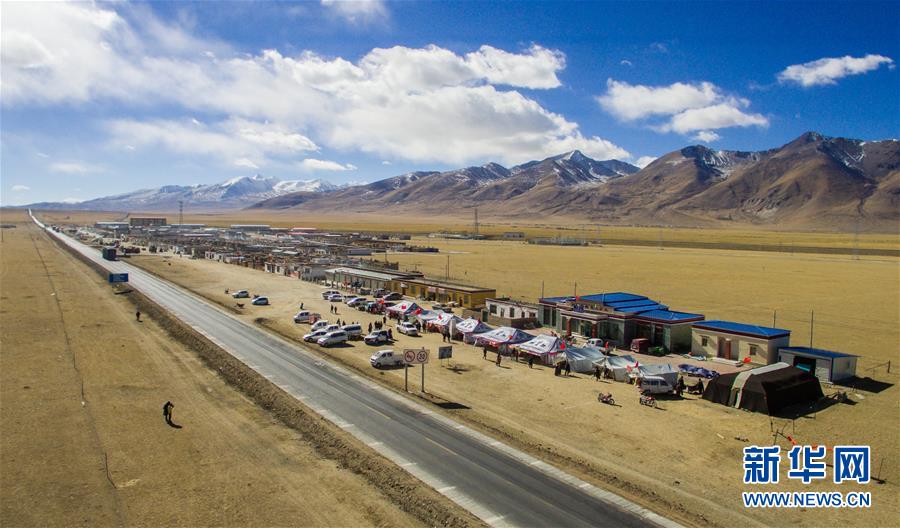 這是在青藏公路旁搭建的那曲縣香茂鄉(xiāng)畜產品展銷會(2017年11月25日無人機拍攝)。 新華社記者 劉東君 攝