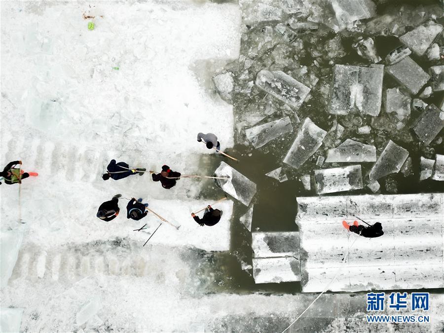 在松花江哈爾濱段江面,工人們在進(jìn)行切割和采冰工作(12月12日無人機(jī)拍攝)。 黑龍江哈爾濱市的冰雪主題樂園哈爾濱冰雪大世界的采冰和建設(shè)工作近日拉開帷幕。為保證足夠的優(yōu)質(zhì)冰供給,每天有近千名采冰人和700多輛運(yùn)冰車參與到采冰工作。 新華社記者 王松 攝