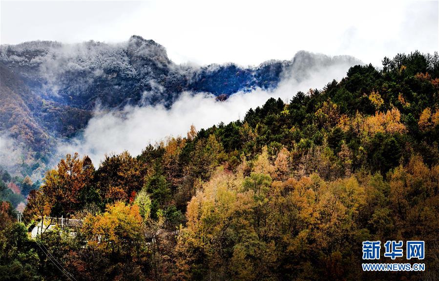 云霧中的鬼谷嶺國家森林公園山頂白雪皚皚,山腰秋色正濃(11月8日無人機(jī)拍攝)。  新華社記者陶明攝