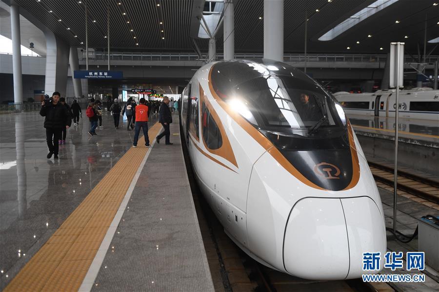 12月25日,杭黃高鐵D9551次首發(fā)列車即將從杭州東站駛出。