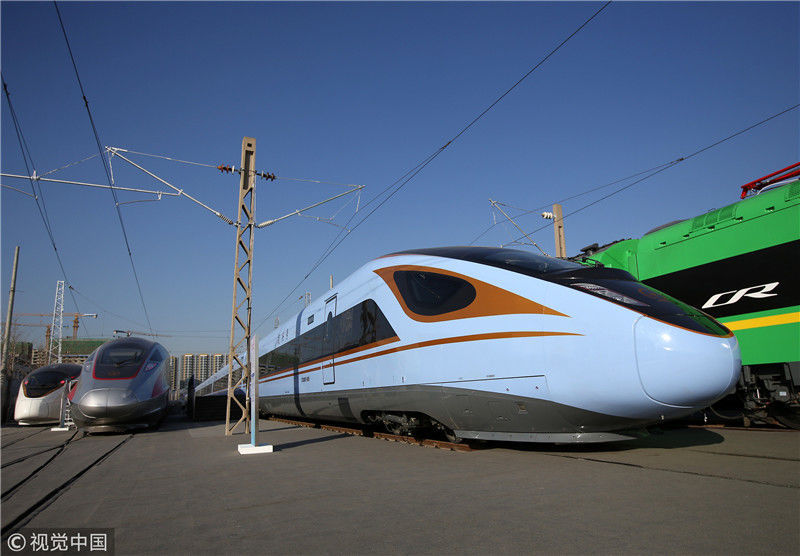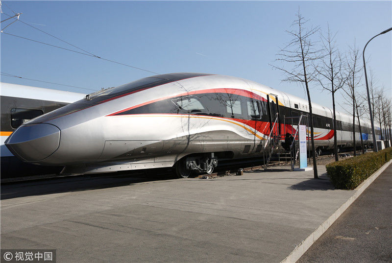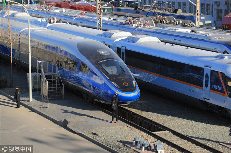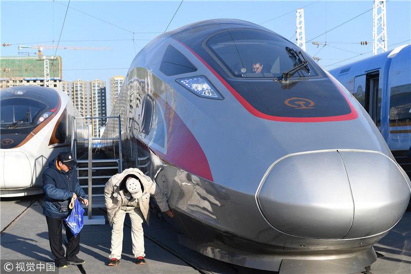 2018年12月24日,北京,中國鐵路科技創(chuàng)新成果展在國家鐵道試驗中心舉行。新型復(fù)興號動車組實車首次公開亮相,現(xiàn)場體驗乘車運行。視覺中國